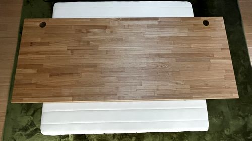 天板加工終了。とはいえやったことと言えばニス塗りとヤスリがけ、あとは鬼目ナット加工のみ。さすがに丸穴開けは危険すぎると思ったので店にお願いした。それでもオール加工の3分の1程度の金額で抑えることができたので良しとしよう。