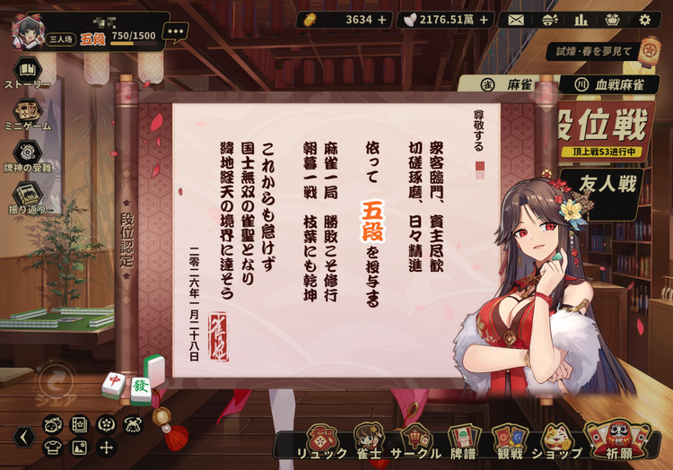 四麻が五段だったので、途中から実装された三麻も五段にしようかなってことでサクサク進めてたんだけど、四段になったのが昨年1月で、そこから上級戦のみしか参戦することができず、素人刈りができなくなったおかげで苦戦しまくり。1位25pt、2位0pt、3位-20ptってなptの振り幅なので連敗するとどんどんptが減ってしまい連勝し続けないと取り戻せないのが辛すぎた。